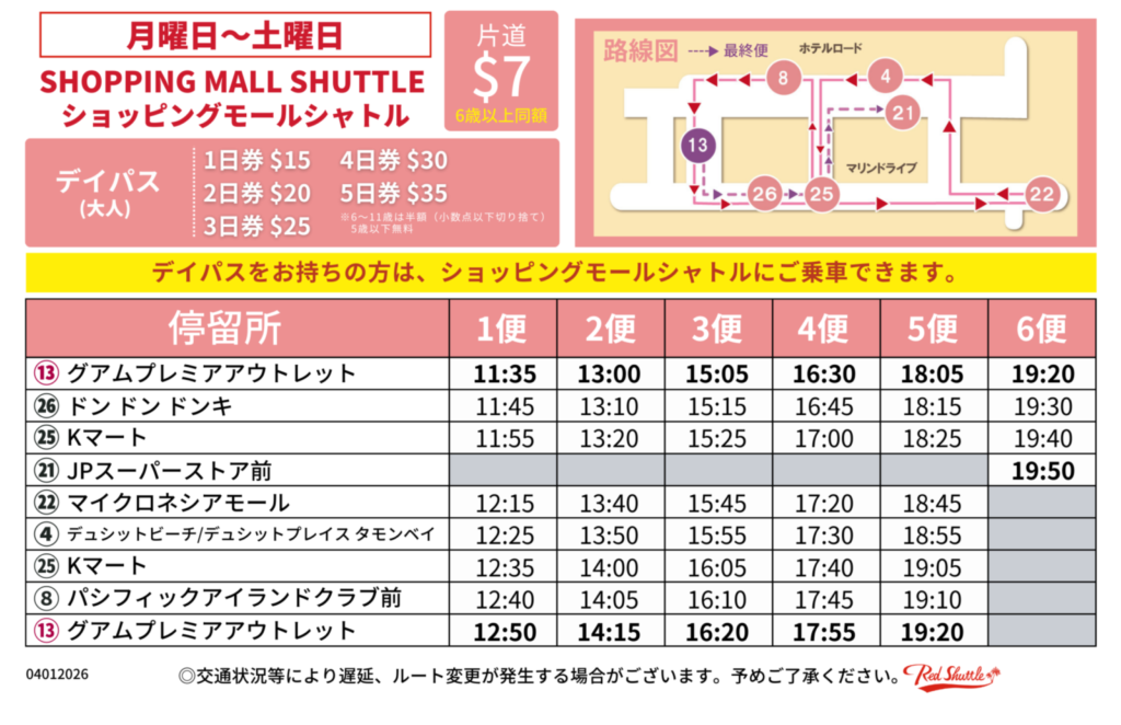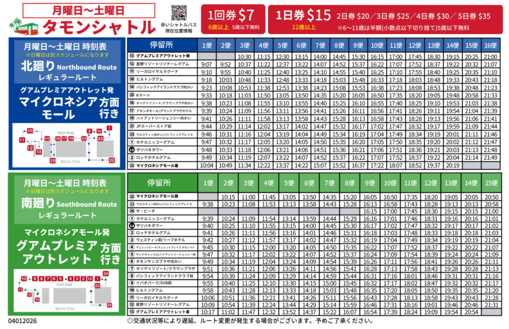 ※2026年4月12日はタモンシャトルは「タモンナイトマーケットが中止の為」通常スケジュールで運行致します。※土曜日スケジュールをご覧ください。 ※ナイトマーケット開催の日曜日のスケジュールはこちらです。日曜スケジュール